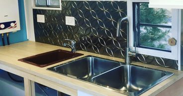 New countertops are installed complete with sinks and taps. The brown sink is original to the camper and is now for hand washing.